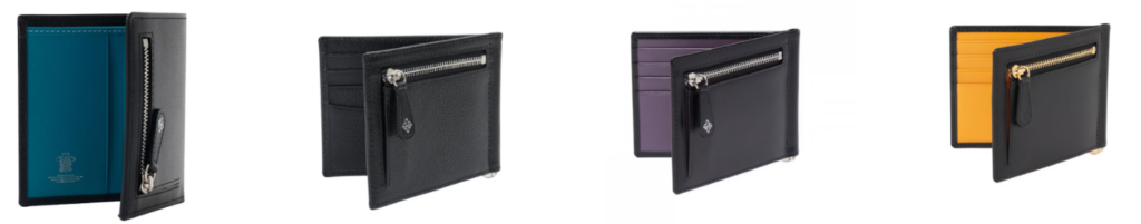 デザインはクラシックかつ無駄を排したシンプルな構造で、派手さはないものの、手にするほどに分かる本物の質感があります。内装にはコントラストのある差し色が入ることが多く、開いたときのさりげないアクセントも英国ブランドらしい粋なこだわりです。