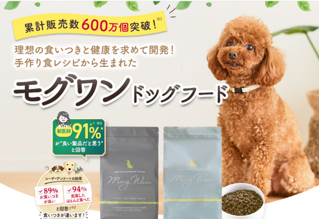 モグワンドッグフードは、株式会社レティシアンが提供するプレミアムドッグフードです。「本当は手作りごはんをあげたい」という愛犬想いのオーナーさんの声から生まれた、手作り食の安心感・美味しさ・栄養バランスをドライフードで実現したという画期的なコンセプトのフードです。累計販売個数は500万個を突破し、イギリスのペットフード専門工場で品質管理を徹底して製造されています。