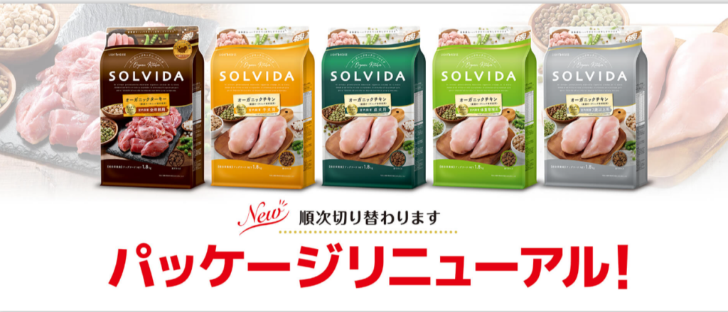 オーガニックへのこだわり・ライフステージ別選択・チキンアレルギー対応→ソルビダ:USDA認定機関認定のオーガニック素材70%以上・ターキーラインナップも充実しています。