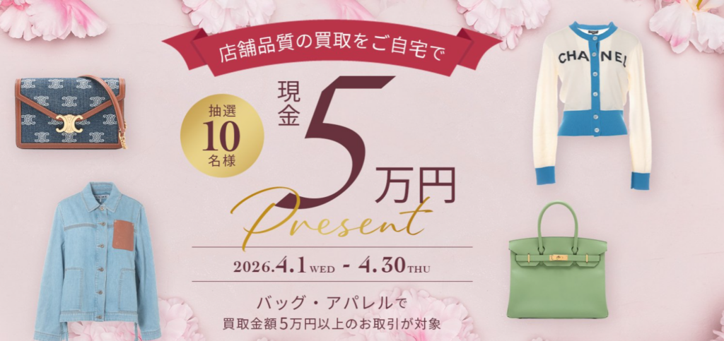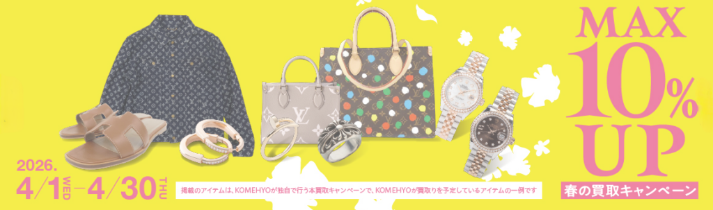 ジュエリー・時計・バッグなど対象アイテムの買取金額アップキャンペーンを定期開催中。LINE友だち登録で宅配クーポンコードを受け取れるキャンペーンも実施中。詳細はコメ兵宅配買取公式サイトをご確認ください。