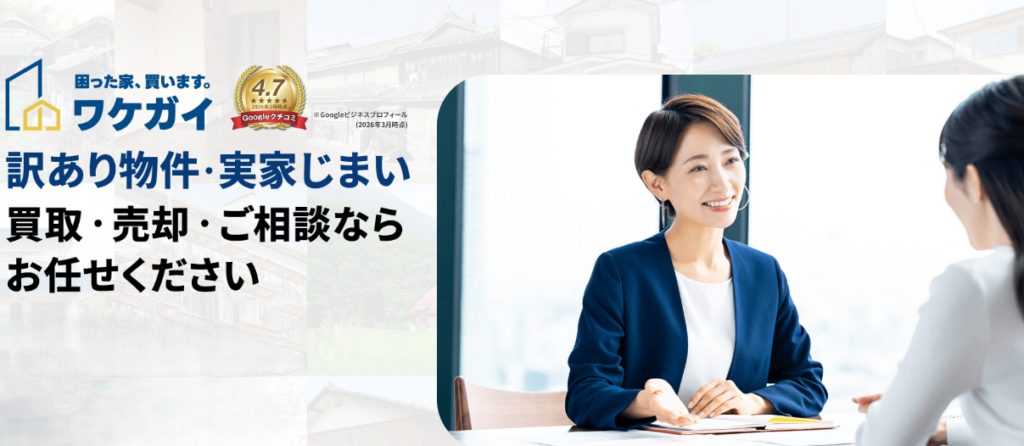 ワケガイは、他社で断られた難しい物件でも積極的に対応する訳あり物件のプロフェッショナルです。全国対応・最短3日の現金化という圧倒的なスピード感と、法律の専門家との連携による安心感が支持されています。「一刻も早く空き家を手放したい」「複雑な権利関係で困っている」という方に特に向いているサービスです。