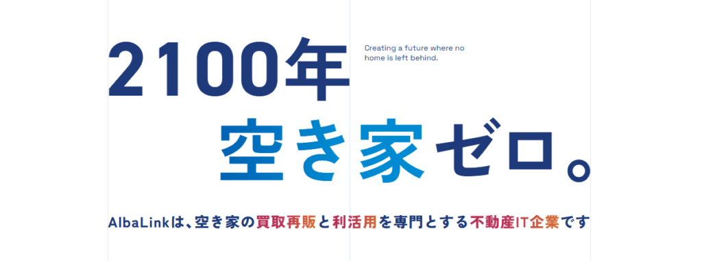 アルバリンク(AlbaLink)は、東証グロース市場に上場している不動産買取再販会社です。空き家・事故物件・再建築不可物件・底地・借地など、流動性が低下しているさまざまな不動産の買取に対応しており、全国に22支店(2026年1月時点)を展開しているため、地方の物件でもスピーディーな査定・買取が可能です。「訳あり物件買取プロ」「空き家買取隊」などの自社メディアを運営し、豊富な情報発信と実績が評価されています。売主への追加費用請求は100%なし、残置物そのままで買取可能という明瞭な姿勢も多くの利用者に支持されています。2026年1月にはテレビ朝日「グッド!モーニング」でも取り上げられた信頼性の高い事業者です。