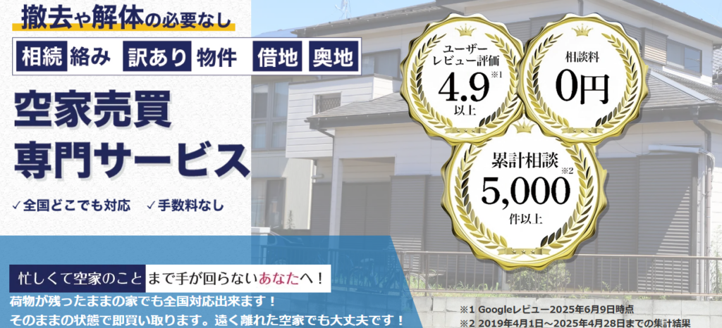 ラクウルは、仲介手数料不要・売却後の責任免除・ワンストップ対応という三拍子が揃った空き家買取サービスです。築古・ゴミ屋敷・訳あり物件など他社で断られた物件でも相談でき、全国対応で遠方の実家売却にも強い点が多くの利用者から支持されています。「早く・手間なく・安心して」空き家を手放したい方に特におすすめの1社です。