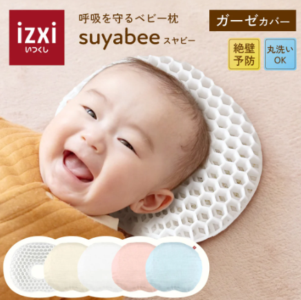 スヤビー(suyabee)はizxi(いつくし)から発売されているベビー枕です。最大の特長は「ダブルハニカム構造」。六角形の蜂の巣状構造を二重に重ねることで枕全体に均一な通気性を実現しており、万が一赤ちゃんがうつ伏せになってしまった際も空気が通る設計になっています。素材にはTPE(熱可塑性エラストマー)を使用し、適度な硬さでありながら赤ちゃんの頭の圧力を六角形の構造で分散。頭をまあるくサポートしながら絶壁・向き癖の予防に役立てられます。カバーはやわらかな綿100%ガーゼ素材で、本体・カバーともに丸洗い可能。出産祝いのギフトとしても人気の製品です。