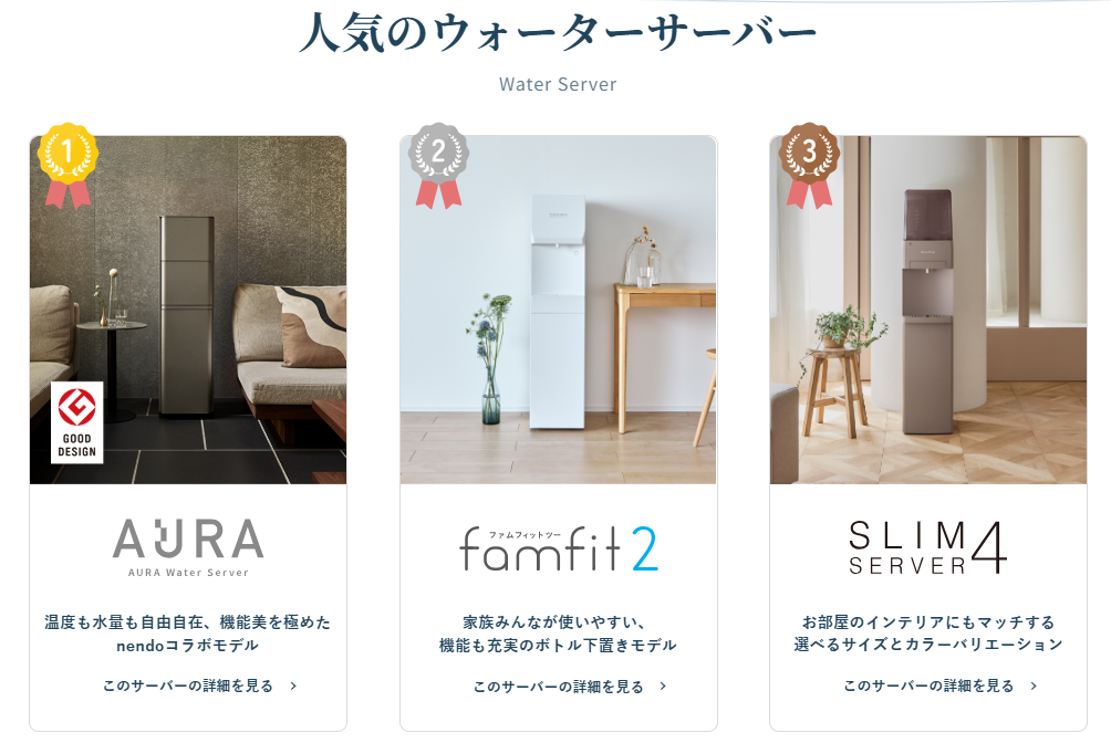 高いデザイン性と使いやすさを兼ね備えた人気の天然水ウォーターサーバーです。グッドデザイン賞を受賞した洗練されたサーバーを多数展開しており、インテリアに美しく馴染む外観が最大の魅力です。