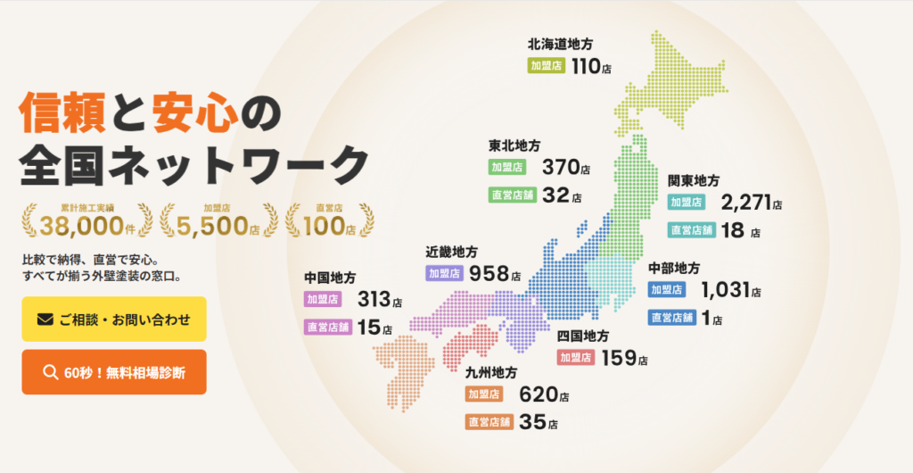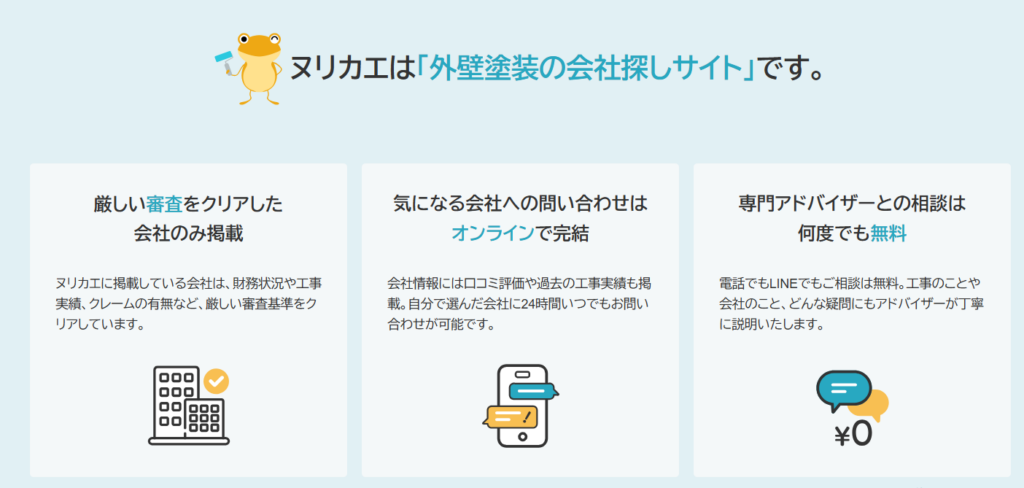 ヌリカエは、全国の厳選された外壁塗装業者を紹介する一括見積もりサービスです。加盟業者は独自基準で審査されており、施工実績・資格保有・保証体制などをクリアした企業のみが登録されています。