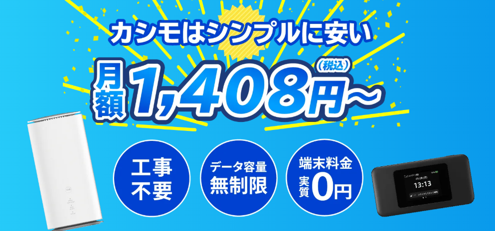 カシモWiMAXは、シンプルで分かりやすい料金体系が特徴のWiMAXサービスです。契約時の複雑な条件やキャンペーンが少なく、「とにかく分かりやすく契約したい」という方に向いています。