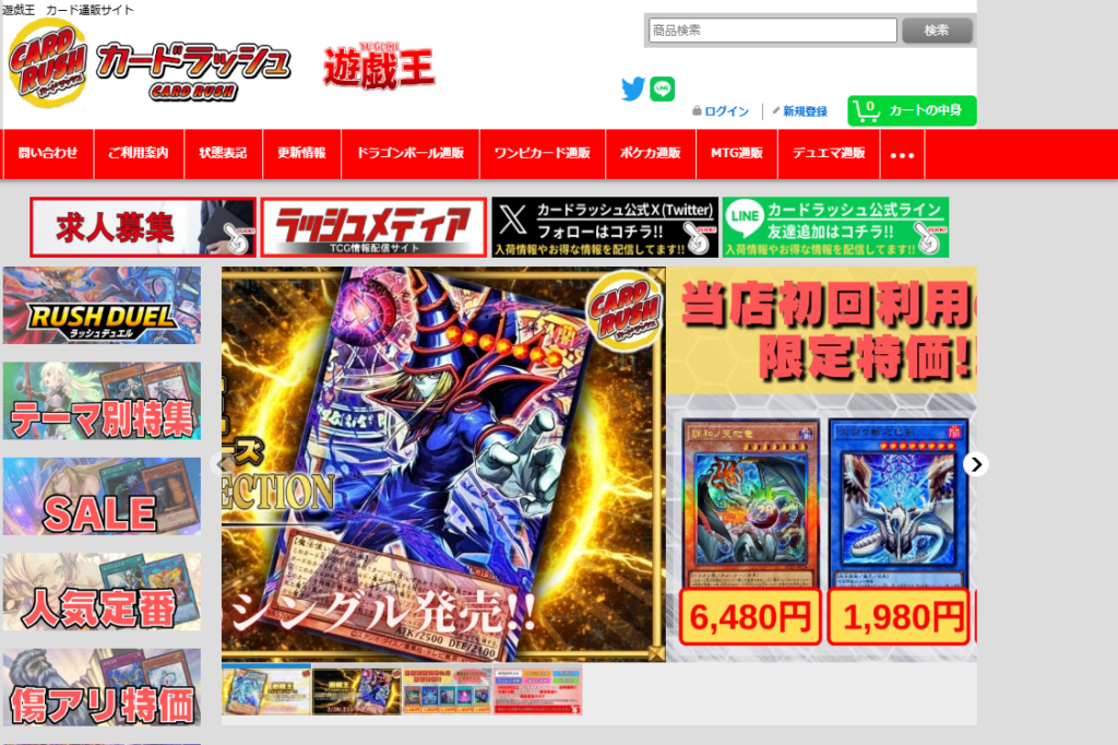 カードラッシュは、遊戯王カードを中心に高額買取で知られるトレカ専門店です。新しいカードだけでなく、初期カードやコレクション性の高いレアカードまで幅広く取り扱っており、相場に基づいた高水準の買取価格が期待できます。買取価格表が細かく公開されているため、売却前におおよその相場を把握できるのも安心材料です。