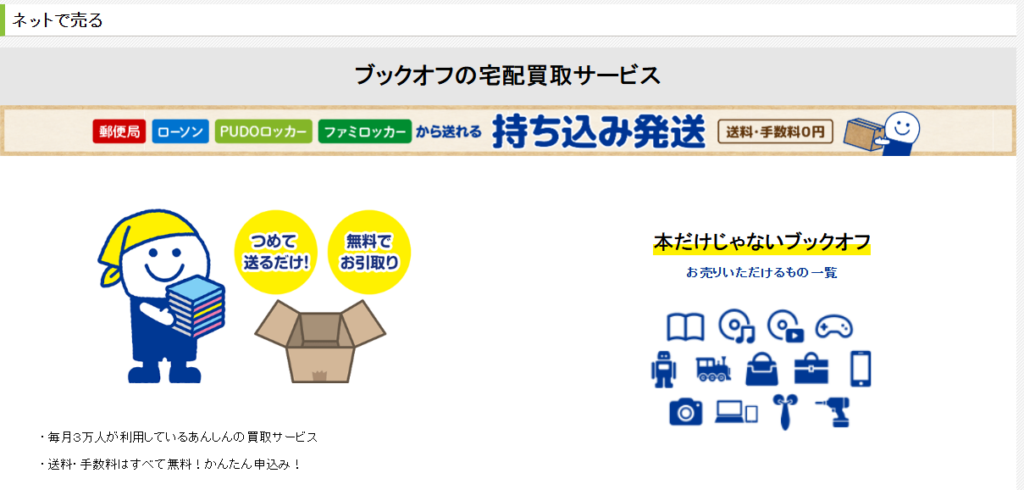 | ブックオフ | 無料 | 全国店舗・対面査定・宅配対応 | 対面で売りたい人・近くに店舗がある人 |